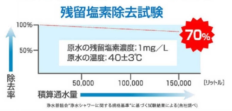 また、下で紹介している浄水器では、残留塩素の除去率も明示されており、グラフを見ると、最初はほぼ100%除去で、150000L使用後でも70%という高い除去率をマークしています。